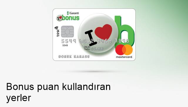 Bonus, ülkemizde ilk markalı ve çipli kredi kartı olarak Türkiye'de milyonlarca kişinin tercih ettiği ve Garanti başta olmak üzere pek çok banka tarafından müşterilerine sunulan kredi kartıdır. Bonus Kart ile yapılan alışverişlerde kazanılan puanlar Bonus Puan olarak adlandırılmaktadır. Bonus Puanlarınızı biriktirerek bir sonraki alışverişte kullanabilirsiniz. Bonus Kart ile seyehatteyken, fatura öderken, alışveriş yaparken, eğlenirken, kısaca belirtmek gerekirse yaşamınızın tüm alanında özel ayrıcalıklı teklif ve kampanyalardan yararlanabilirsiniz. Anlaşmalı olan üye işyerlerinde Garanti Bonus Kart ile yapılacak alışverişlerde yüksek Bonus puanlar kazanırsınız.