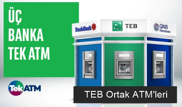 TEB, Denizbank ve QNB Finansbank arasında yapılan anlaşmaya göre bu 3 bankanın müşterileri ATM kullanımlarını ücretsiz olarak yapabilecek. QNB Finansbank, Denizbank ve TEB atm'lerinden hiçbir ücret ödemeden işlem limitleri dahilinde, her ay 3 defa işleme kadar masrafsız ve komisyonsuz olarak para çekebilir, hesabınıza para yatırabilir, kredi kartı borçlarınızı ödeyebilir, sınırsız olarak bakiye sorgulama, kredi kartı borcu sorgulama ve limit sorgulaması yapabilirsiniz. İşte TEB ücretsiz ortak ATM'leri: